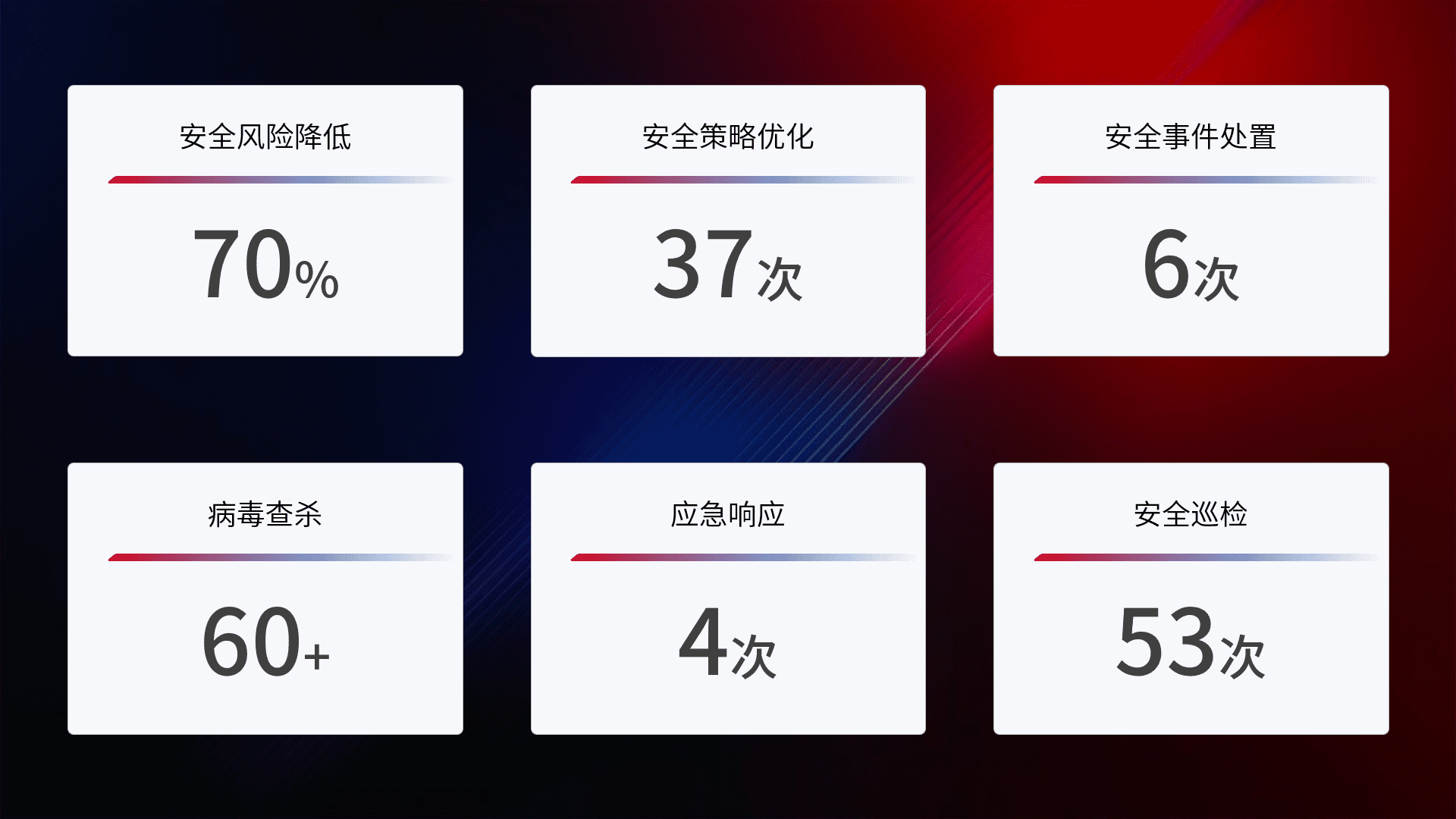 提供全面的安全事件报告体系,,,包括处置报告、、、、周报、、、季度和年度总结,,,,结合持续监控,,,帮助客户深入了解网络安全状况。。。