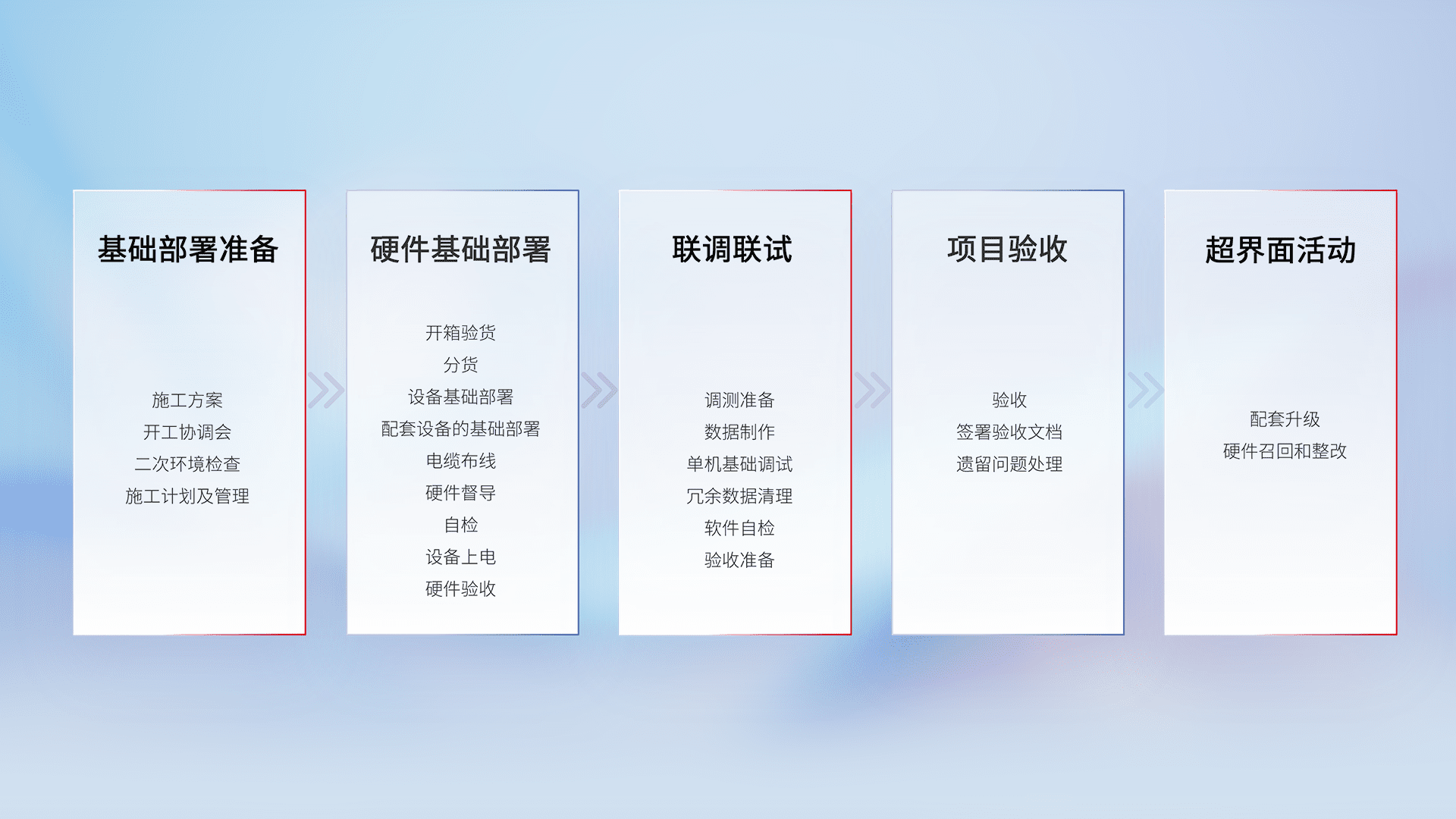 从基础部署准备、、硬件基础部署、、、联调联试、、、、项目验收、、、越界面活动的全过程可追溯,,,,保证施工质量和进度。。